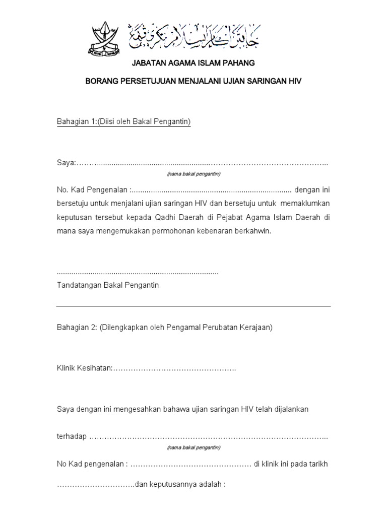 Published on oct 15, 2014. Dalam borang perkahwinan ada satu borang ujian hiv. Surat perakuan cerai (jika pemohon duda atau janda). Saringan hiv dan bersetuju untuk memaklumkan keputusan tersebut kepada pendaftar perkahwinan, perceraian dan ruju' orang islam wilayah persekutuan di mana saya mengemukakan permohonan kebenaran berkahwin. Jabatan agama islam wilayah persekutuan, kompleks pusat islam, jalan perdana, 50519 kuala lumpur.